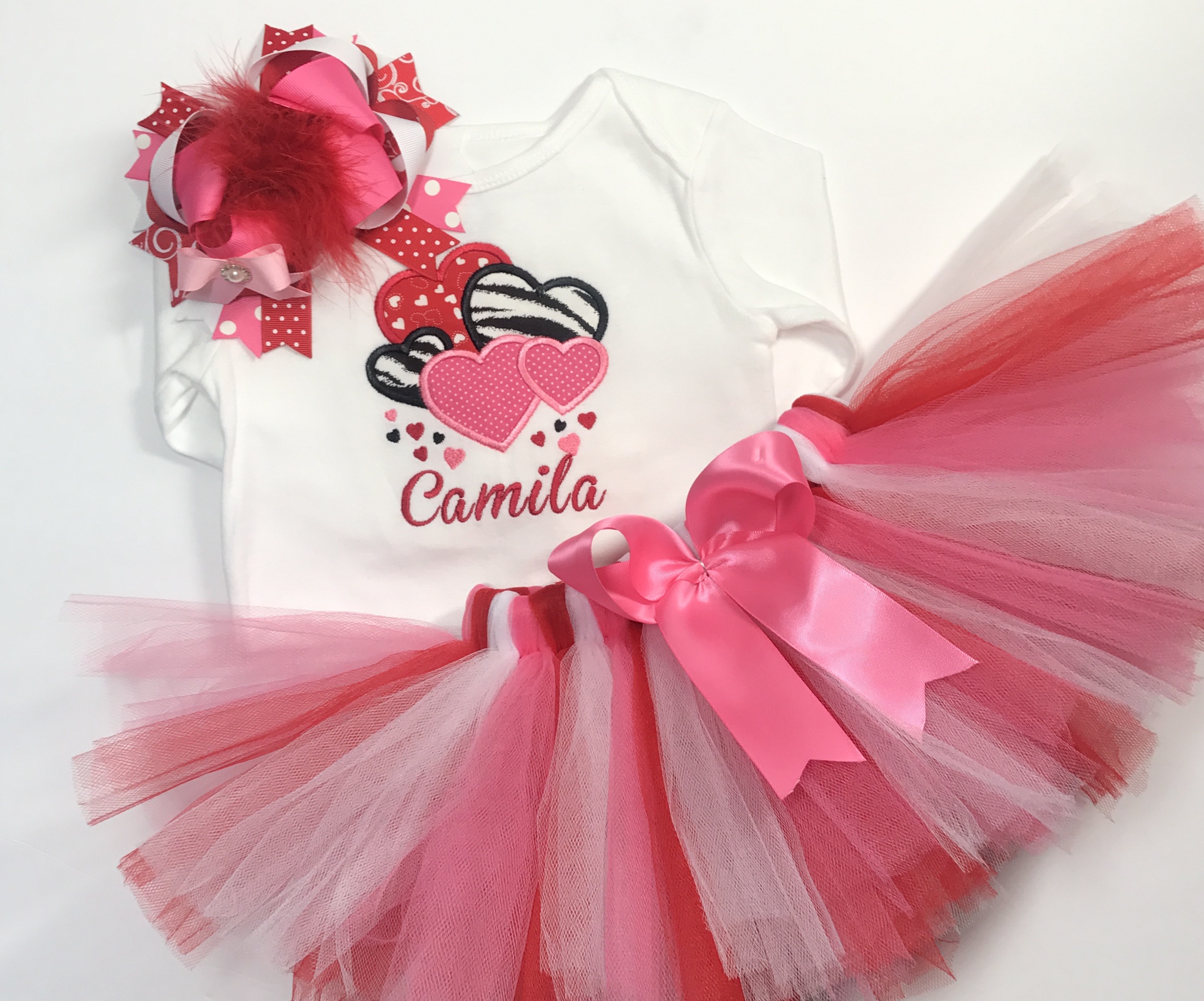 Super cute Valentine's Day outfit for your little girl. The bodysuit is decorated with sassy fabrics using an embroidery machine. It can be personalized with the name of your choice just let me know! Also included is an over the top hairbow and beautiful fluffy Tutu. It's the perfect outfit for pictures or just to strut around town!