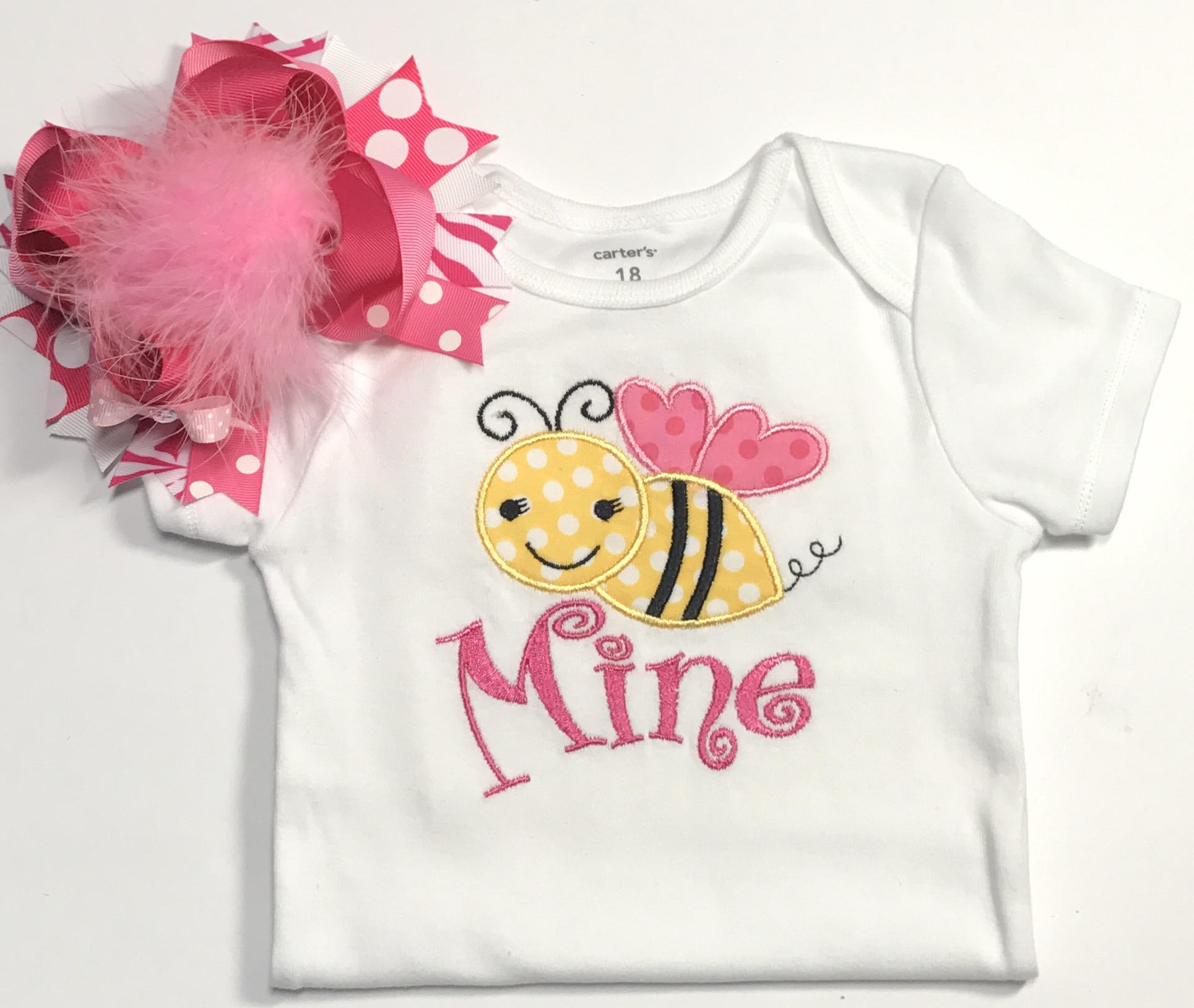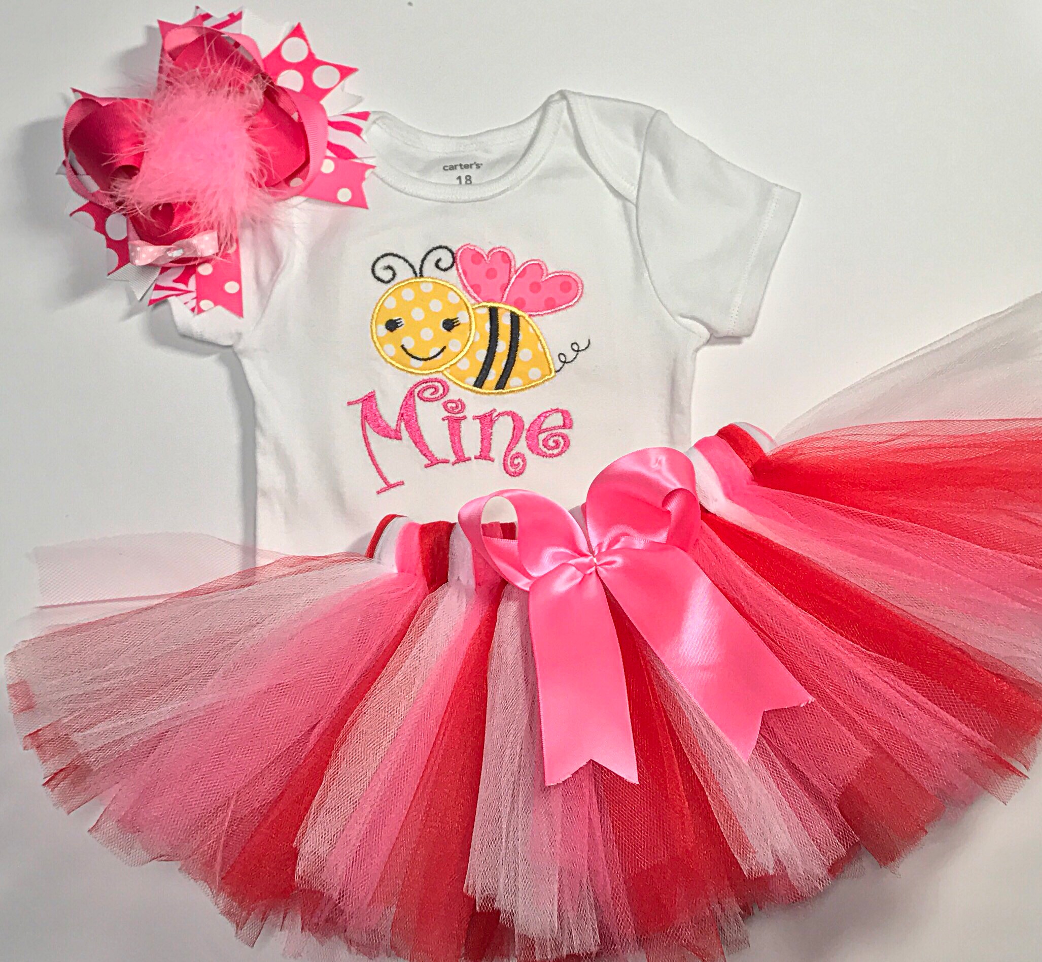 Super cute Valentine's Day outfit for your little girl. The bodysuit is decorated with a cute bee using an embroidery machine. It can be personalized with the name of your choice just let me know! Also included is an over the top hairbow and beautiful fluffy Tutu. It's the perfect outfit for pictures or just to strut around town!