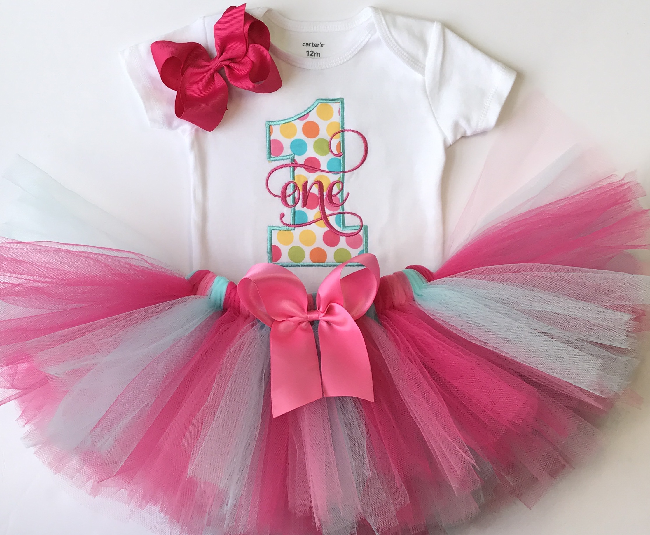Super cute First Birthday outfit for your little girl. The bodysuit is decorated with a cute appliqué using an embroidery machine. It can be personalized with the with the name of your choice just let me know! Also included is a Cute hairbow and beautiful fluffy Tutu. It's the perfect outfit for pictures or just to strut around town!