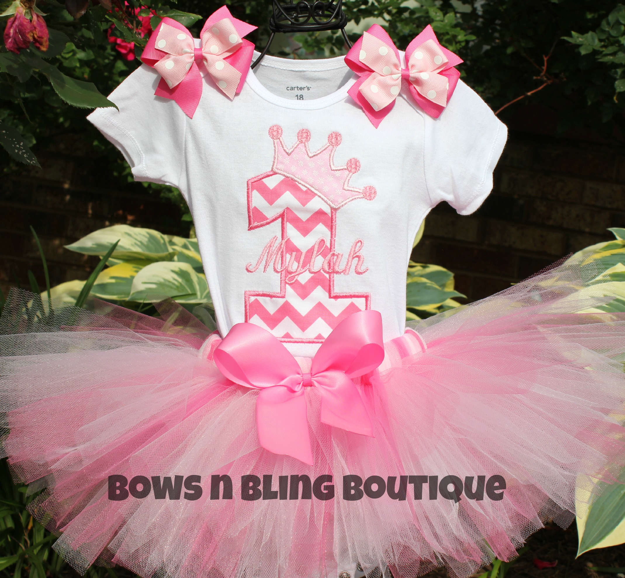 Super cute First Birthday outfit for your little girl. The bodysuit is decorated with a cute Princess appliqué using an embroidery machine. It can be personalized with the with the name of your choice just let me know! Also included is a Cute hairbow and beautiful fluffy Tutu. It's the perfect outfit for pictures or just to strut around town!