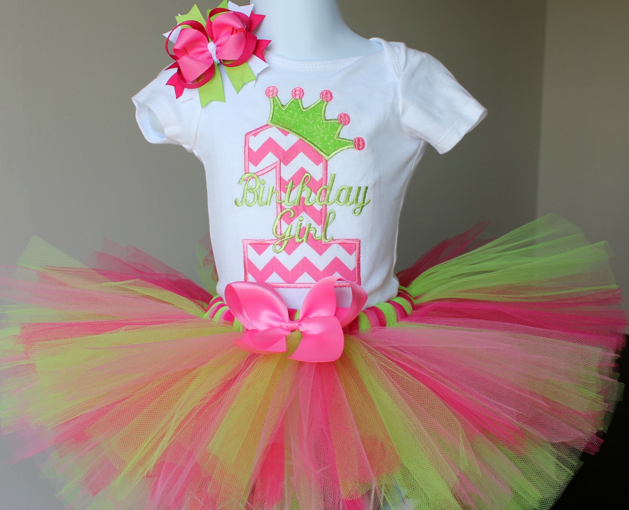 First Birthday Outfit Pink Green Chevron Princess Tutu and Hairbow
